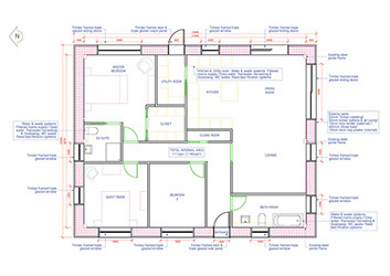Lime render to east & west gable end walls with European cedar vertical timber slat cladding south & north with wrap over standing seam tin roof with integral concealed guttering. And featuring unpainted refined site clay plastering to all internal walls.