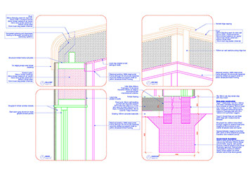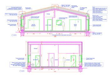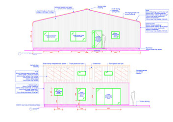 Wall and roof construction to be formed tight against and independent of the retained steel portal frame and set upon self draining locally sourced rubble filled trench foundations and earth filled bag perimeter plinth.