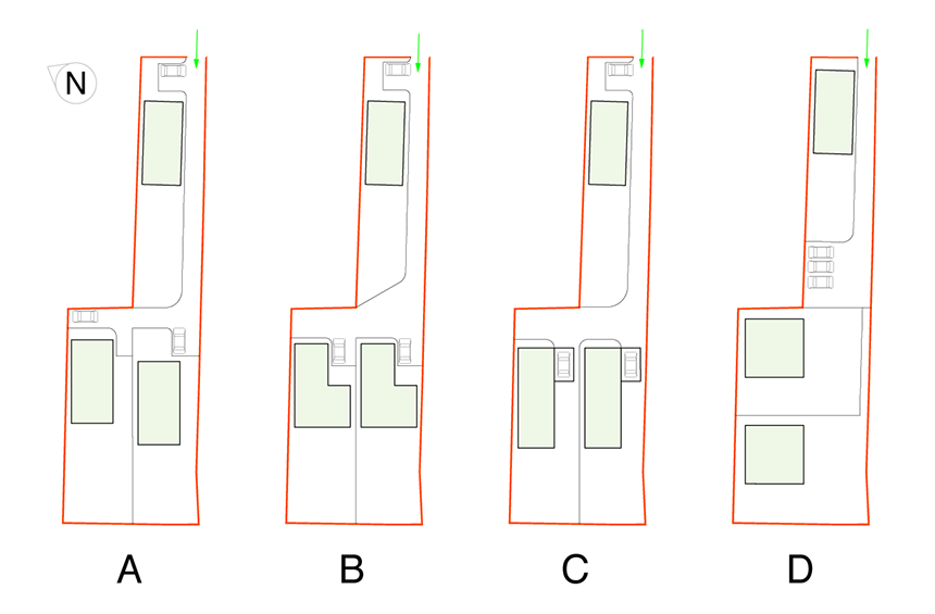 Removing existing buildings and retaining 9no TPO trees the site was most effective divided in to three roughly equal sized plots.